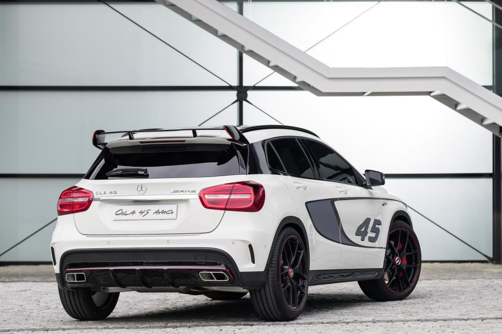 Auch optisch distanziert sich der GLA 45 AMG deutlich von der Basis A-Klasse: Ein hochglanz-schwarzer Frontspoiler sowie (zusätzliche) Lufteinlässe derselben Farbe, AMG Frontschürze mit Schriftzug und die große Kühlluftöffnung lassen den Sportler hervorstechen. Daneben verfügt der Mercedes noch über einen verchromten “Twin-Blade” Kühlergrill, Seitenschweller-Verkleidungen und Dachreling in Hochglanzschwarz, einen großen Heckflügel sowie Endrohrblenden für die AMG-Sportauspuffanlage.